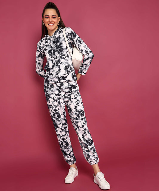 Popwings Women Casual Self Design Black & White Tie & Dye Printed Sweatshirt & Jogger Co-Ords Set